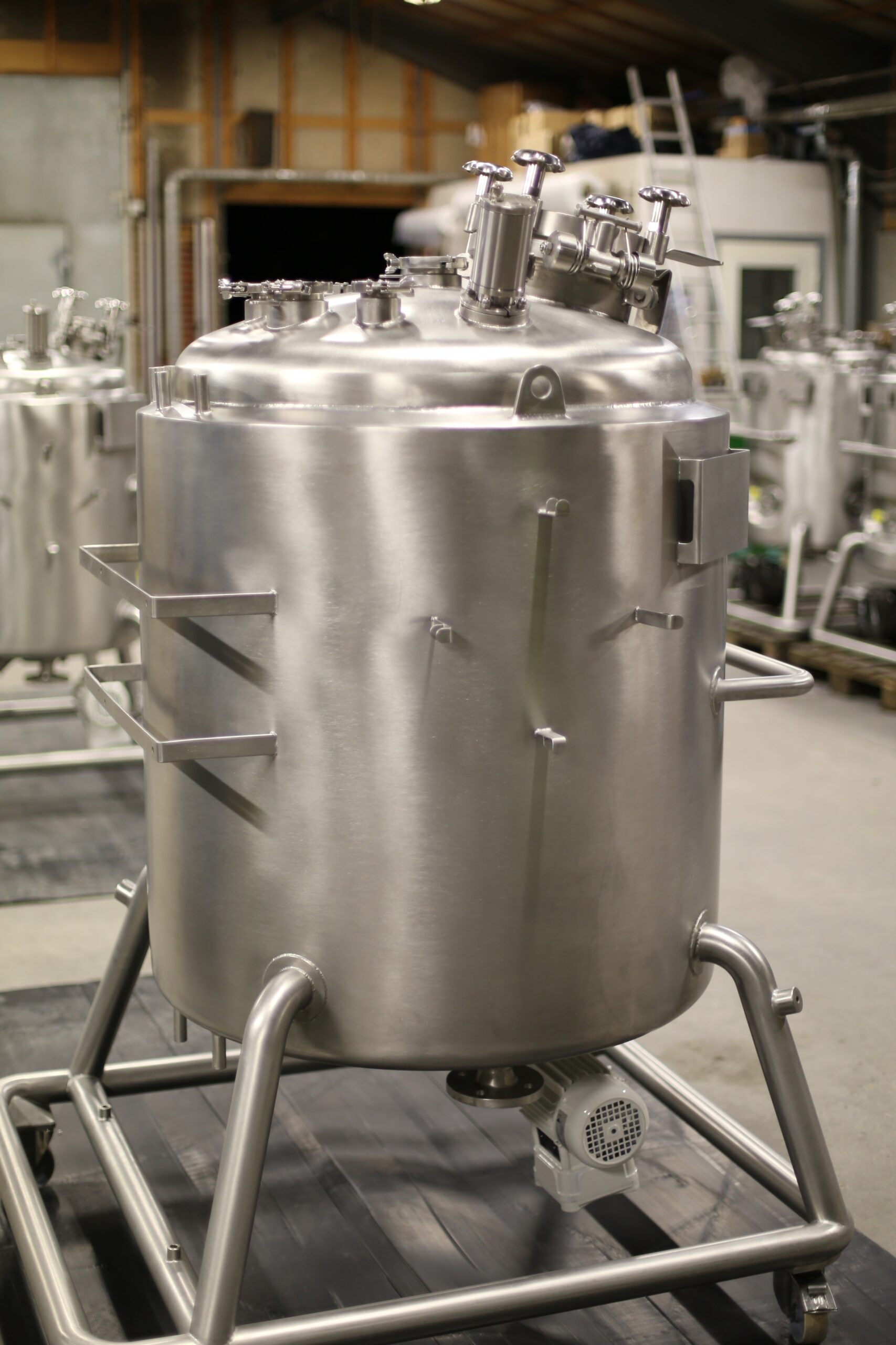 A mobile tank is a flexible solution when a business is looking for tanks that can easily be moved from one process line to another. The main characteristic of mobile tanks and vessels is that they are placed on a frame with wheels or on brackets for forklift transport. Thus, they are more mobile and can be moved around in the production line or the laboratory. In terms of max capacity, stainless-steel mobile tanks and vessels have an upper volume limit of 1000 liters.